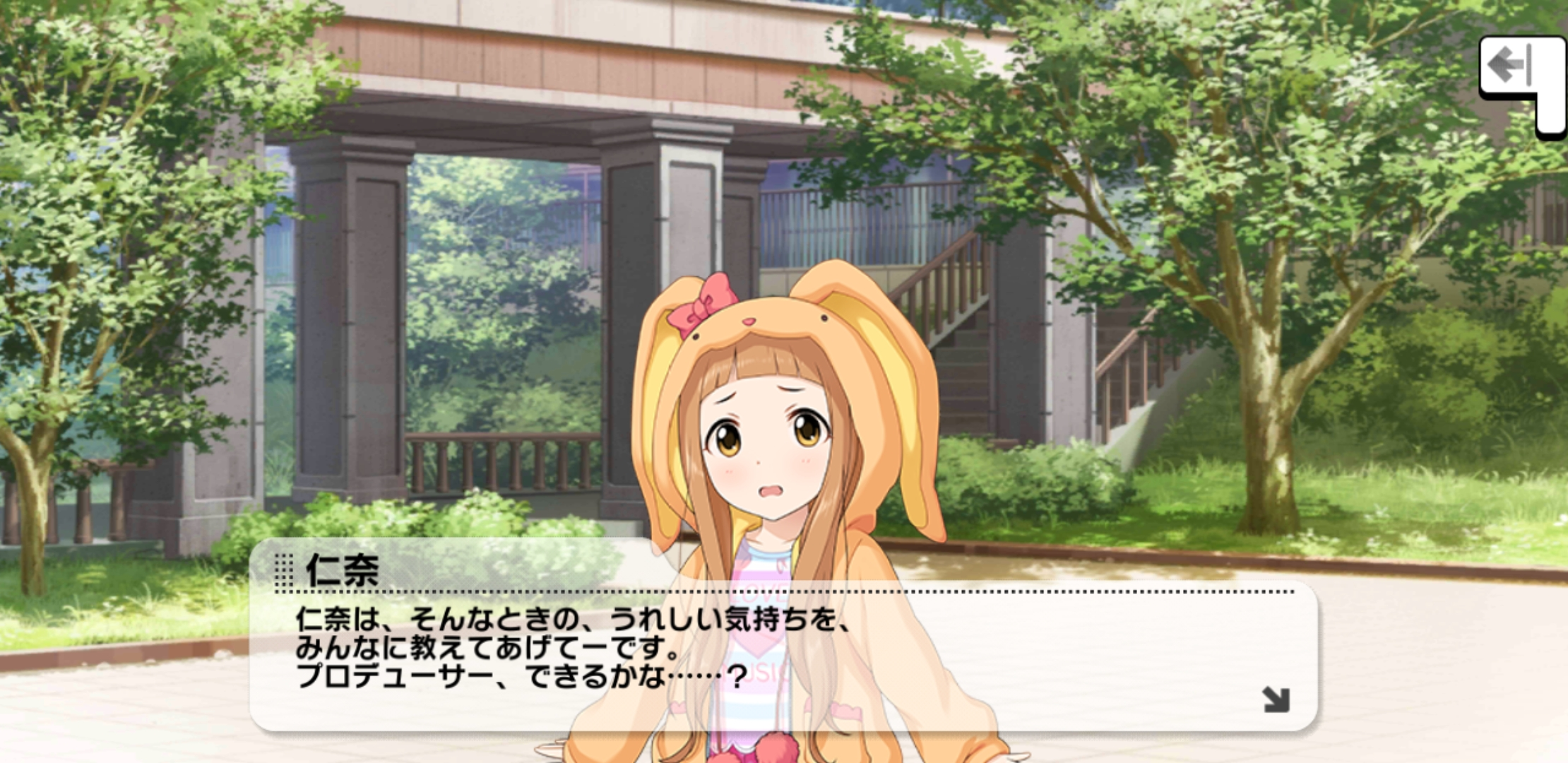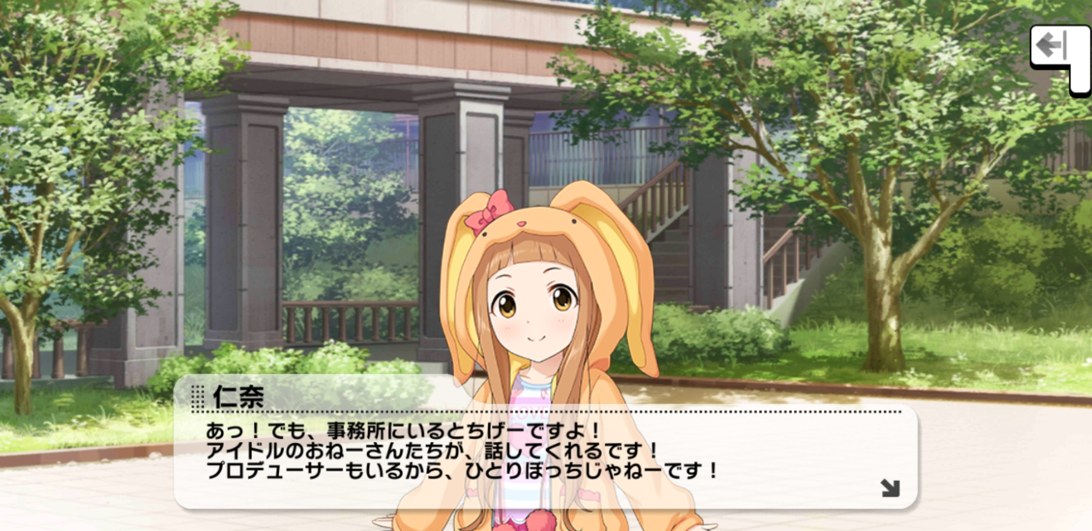 데레스테 친구들 잔뜩 특훈 커뮤에서도 니나는 "토끼 니나는 외로움을 잘 타지만", "사무소에 있으면 아이돌언니들과 프로듀서가 있기 때문에 더이상 외롭지 않다"며