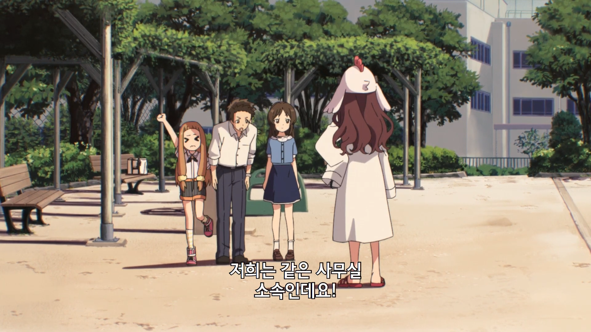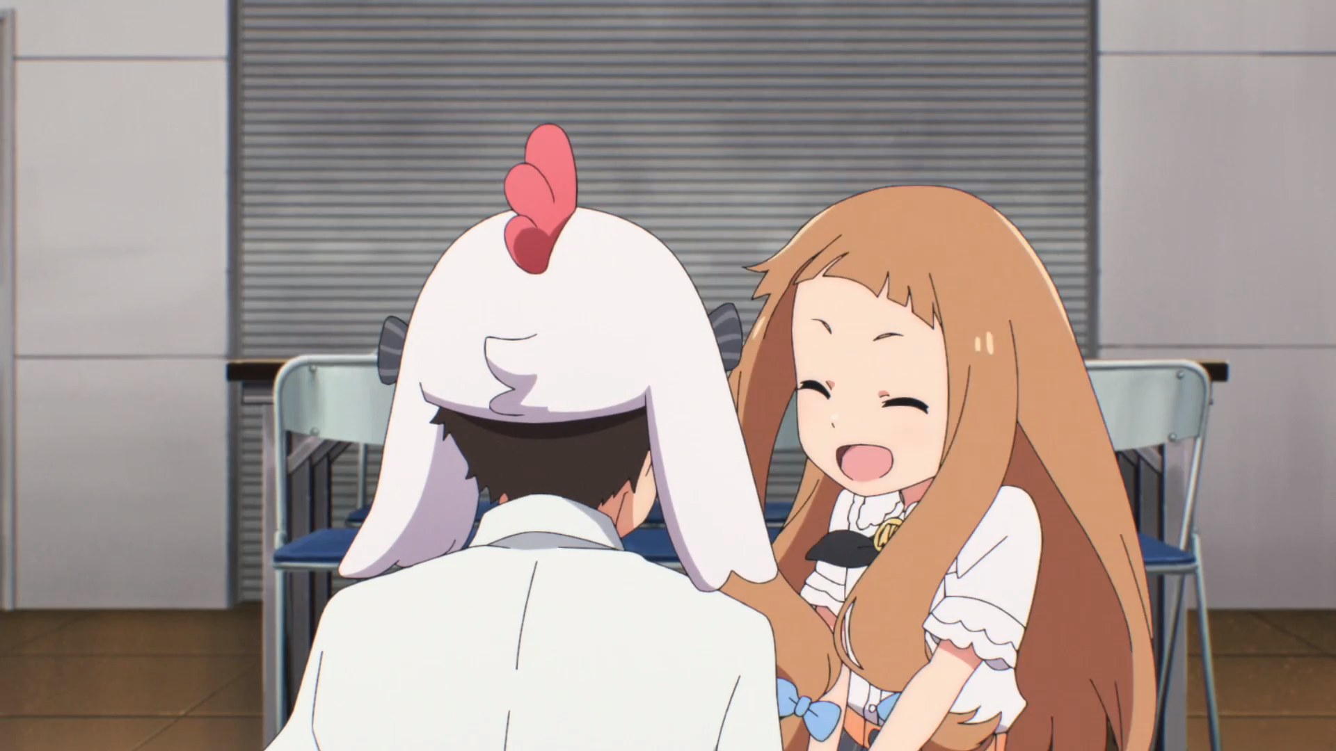 鶏の着ぐるみを返すまえに、プロデューサーと仁奈、ありすを見ながら何か面白いのが思い出したような顔をする志希。