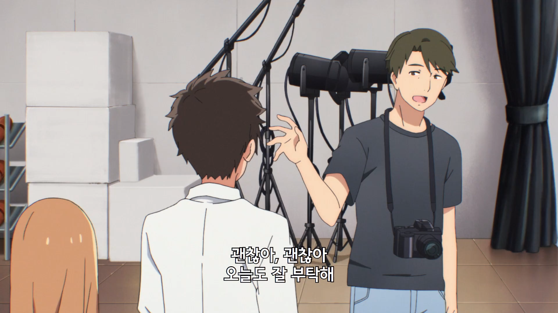 仁奈の写真を撮る出番になると、プロデューサーは着ぐるみは着替えた方がいいと言いますが、それを拒みます。