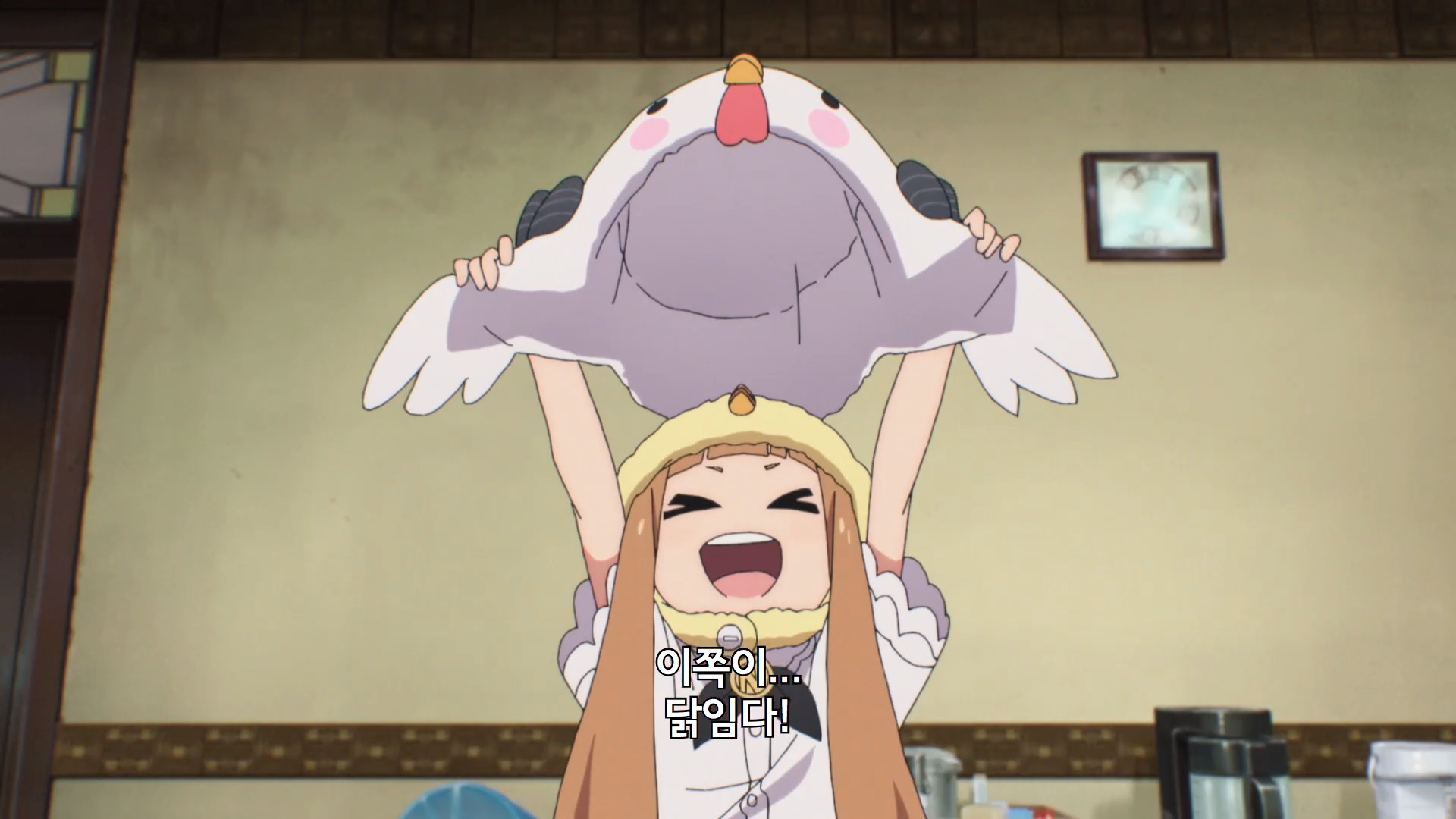 ダンスレッスンのあと、急いで降りてきたため、鶏の帽子を落すことになります。