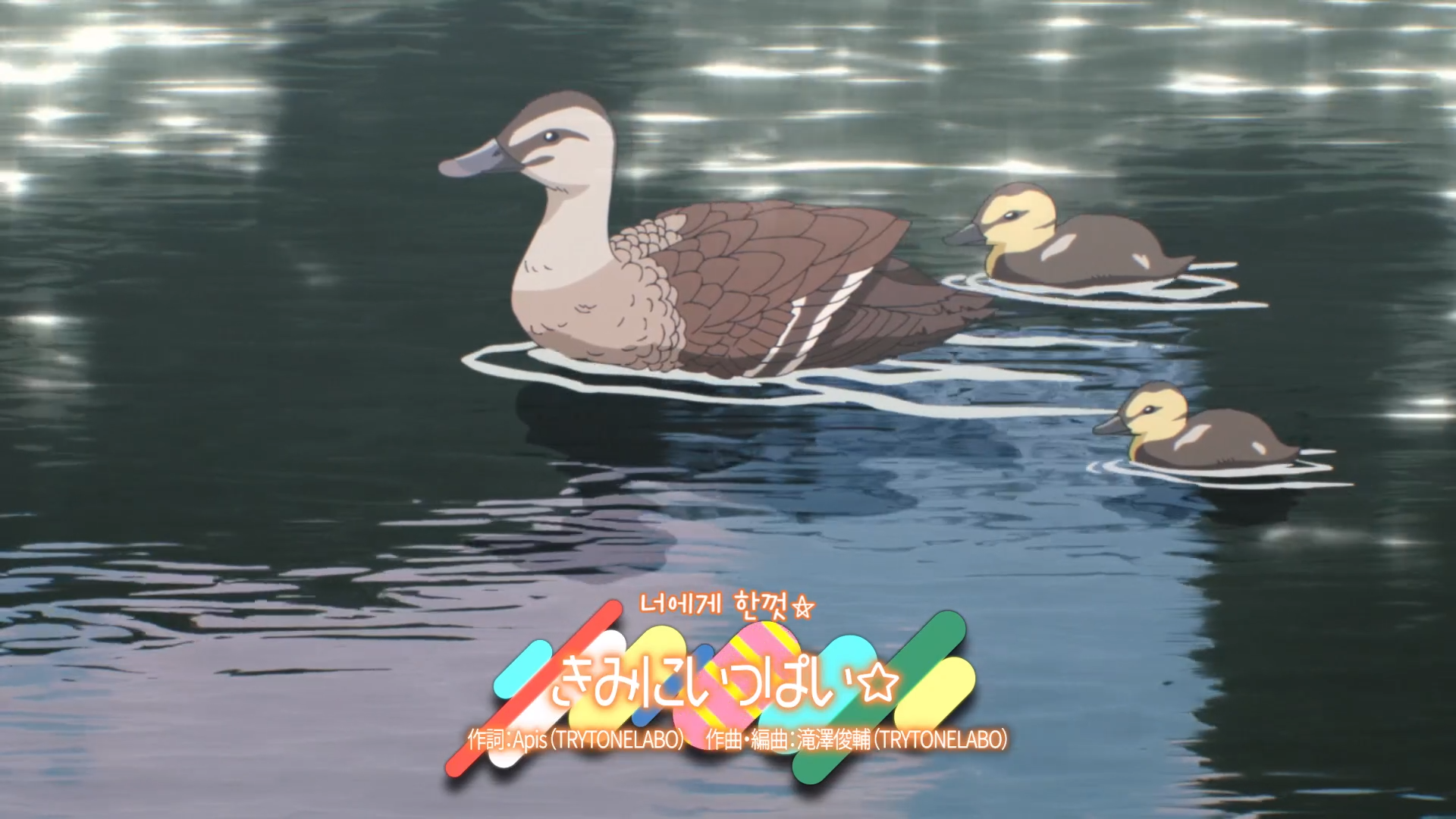 そして川を泳ぐアヒルの親子。 おそらくプロデューサーとありす、仁奈を表すのでしょう。